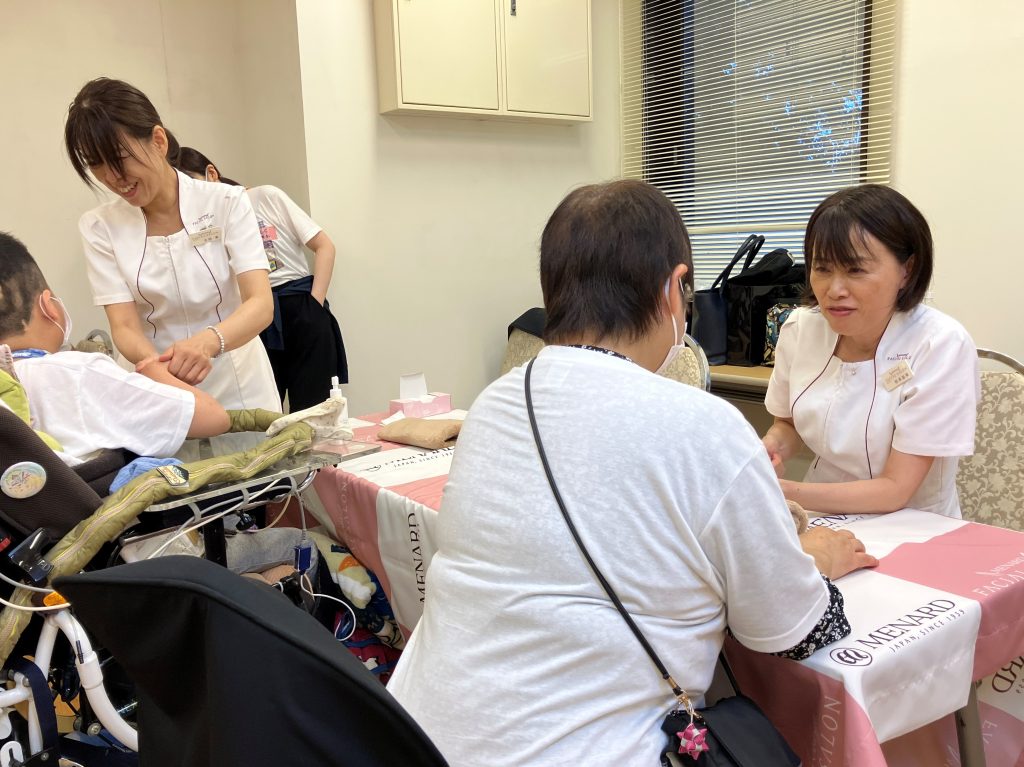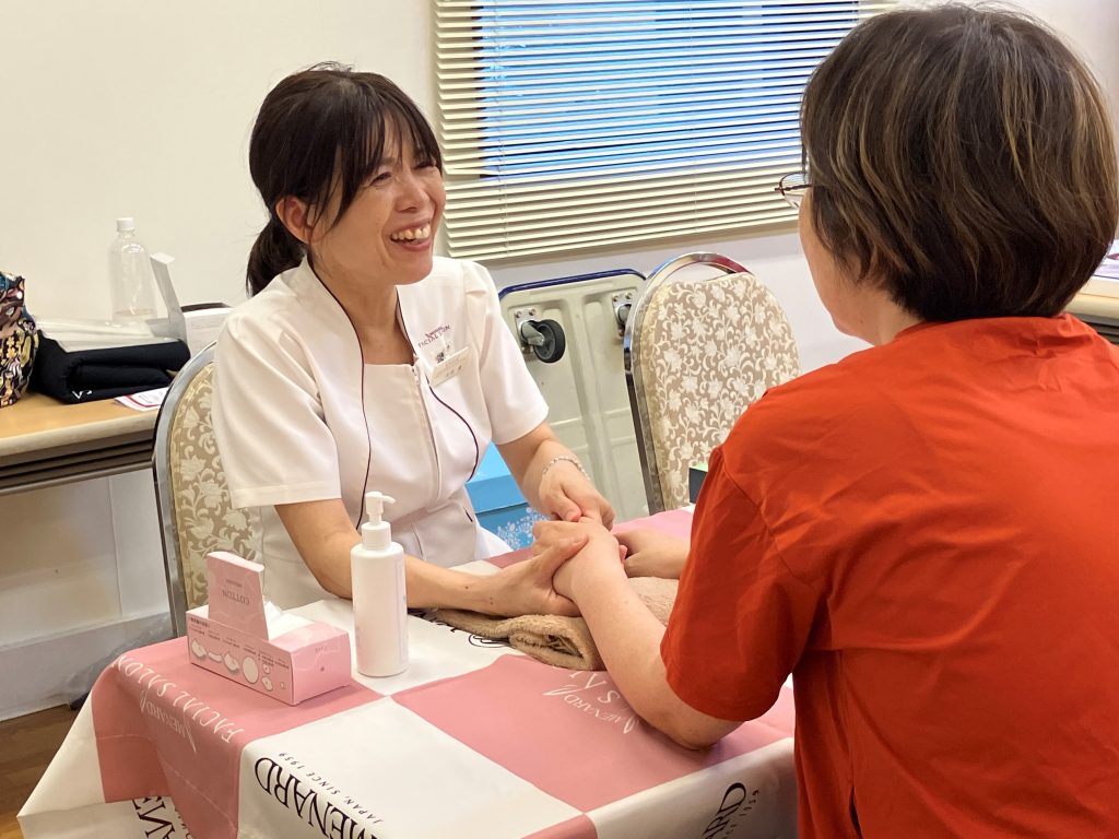 ハンドケアブースでは、親御さまやボランティアさんなどが立ち寄ってくださり、途中からは順番待ちの列ができるほどご好評をいただきました。