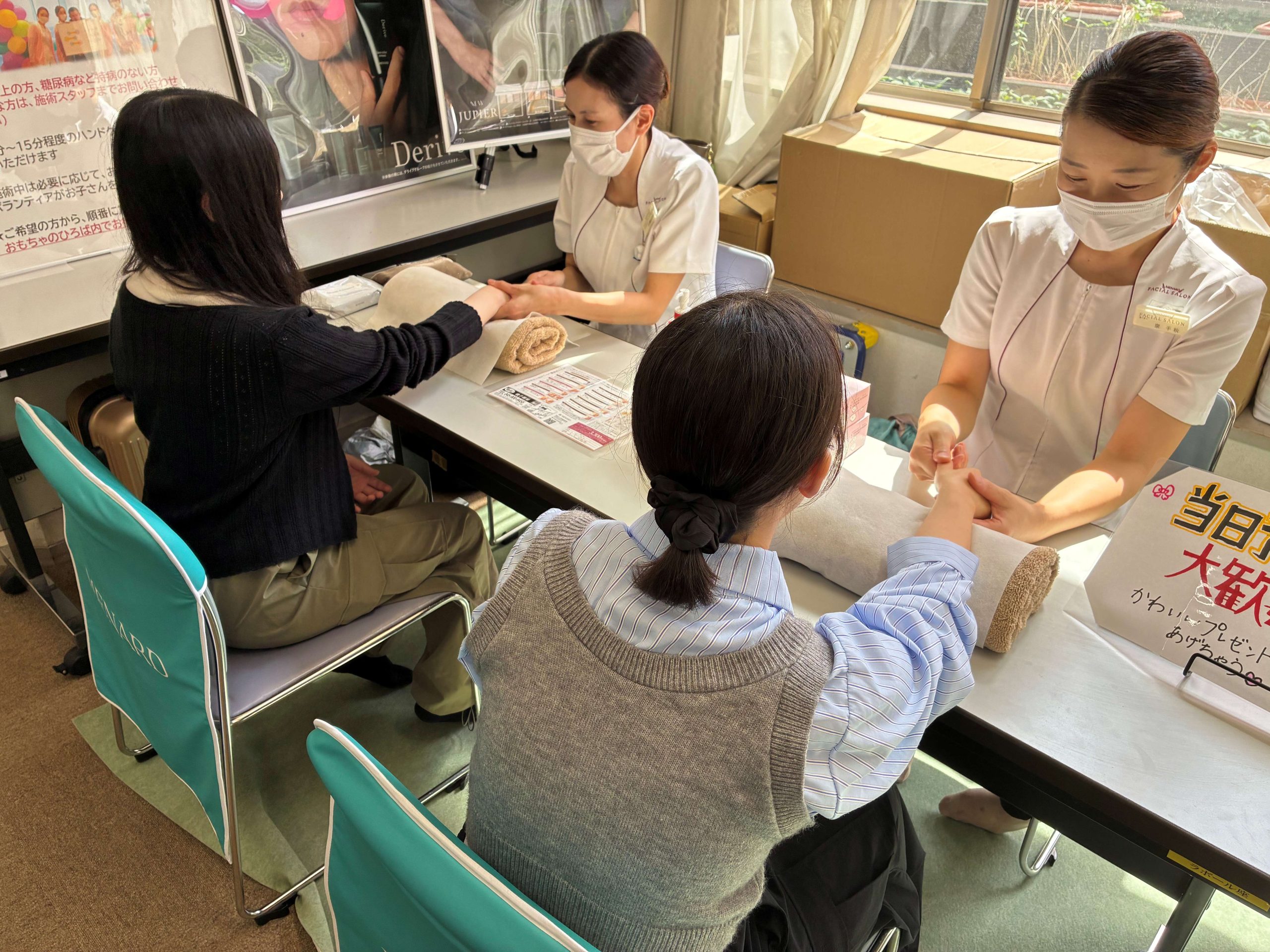 メナードのブースはお子さまがおもちゃで遊ぶお部屋の一角に設けてくださり、親御さまにも安心してビューティハンドケアを楽しんでいただくことができました。